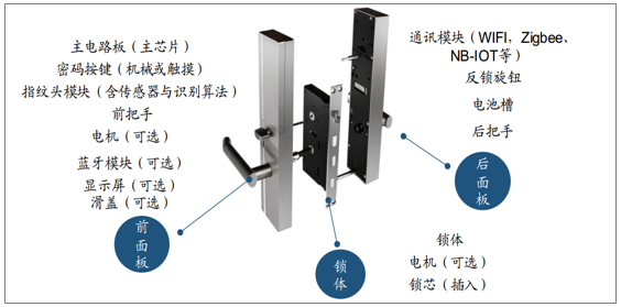 從物理結構上,智能門鎖通常可以分為三部分:前面板、鎖體、后面板;主要零部件包括鎖體、指紋頭(或密碼按鍵)、主電路板、通信模塊等。