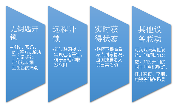 實現“無鑰匙開鎖”,簡便化、智能化明顯。智能門鎖的核心功能是“無鑰匙開鎖”,避免傳統的丟失鑰匙等行為,簡便化突出。在此基礎上借助聯網功能,互聯網時代的智能門鎖在技術上實現了高速迭代,可實現分發開鎖權限、獲得門鎖狀態、與其他設備聯動等多元化功能,具備更豐富和便捷的遠程和管理功能,實現家居場景的物物聯動、安防保護。